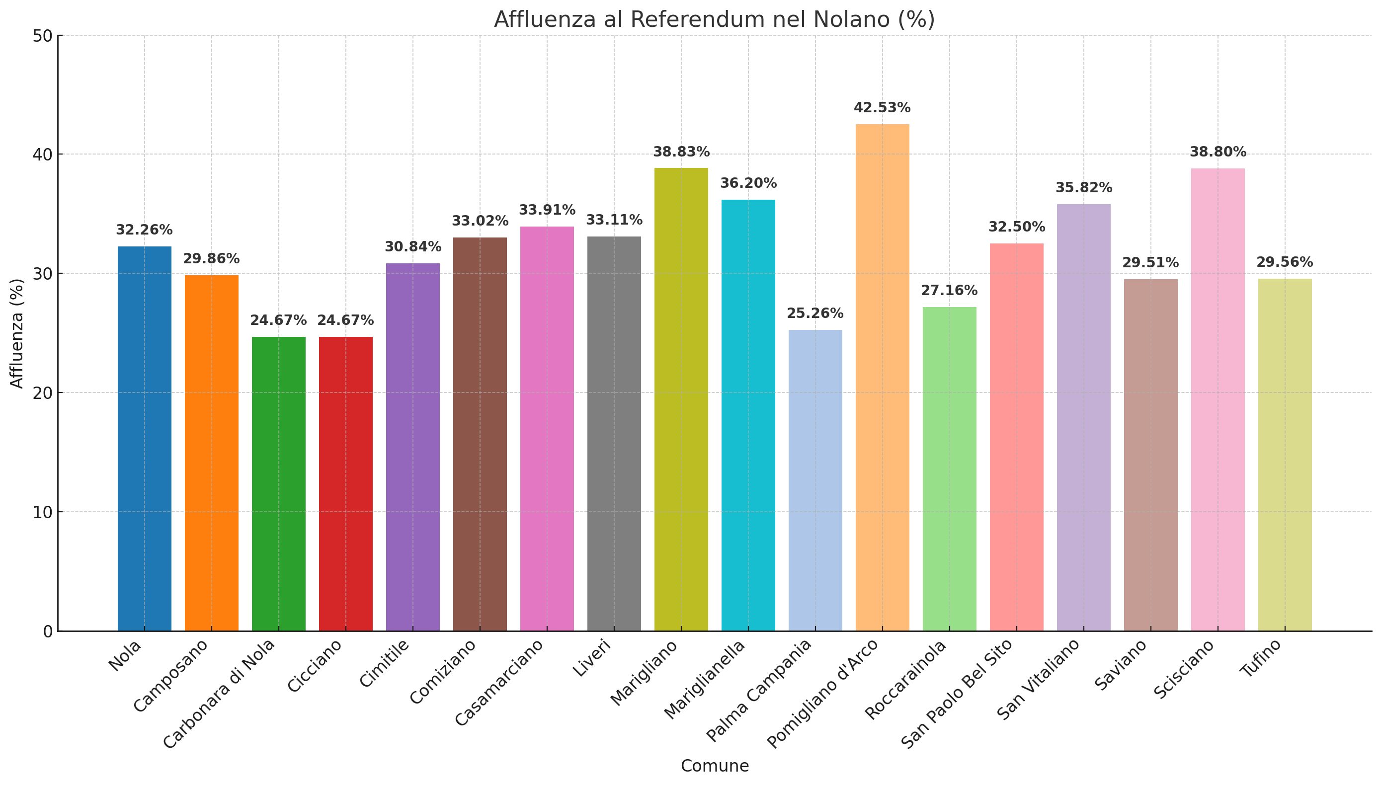 Nel complesso, il quadro nel Nolano evidenzia una partecipazione più dinamica rispetto ad altre zone della provincia, anche se resta evidente la distanza tra i Comuni più “virtuosi” e quelli dove la disaffezione verso il referendum si è fatta maggiormente sentire.