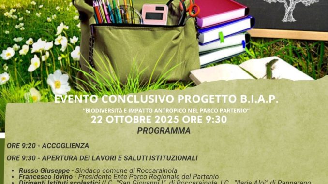 Roccarainola (NA) – Si terrà mercoledì 22 ottobre 2025, a partire dalle ore 9:30 presso la sala multimediale di “Santa Maria delle Grazie”, l’evento conclusivo del progetto B.I.A.P. – “Biodiversità e Impatto Antropico nel Parco Partenio”, un’iniziativa finanziata dall’Unione Europea nell’ambito del programma NextGenerationEU e promossa dal Ministero dell’Università e della Ricerca, in collaborazione con il National Biodiversity Future Center, la Regione Campania e l’Ente Parco Regionale del Partenio.