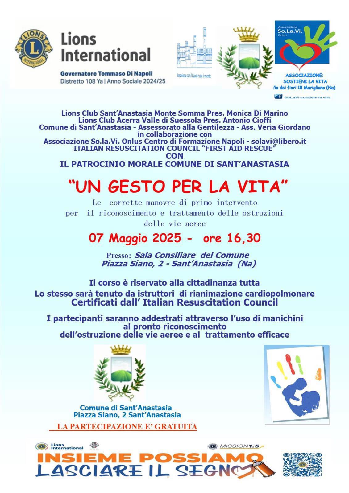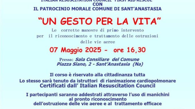 Mercoledì 7 maggio, alle 16:30, l’Aula Consiliare del Comune di Sant’Anastasia ospiterà l’iniziativa “Un Gesto per la Vita”, un corso gratuito di primo intervento aperto a tutti i cittadini.