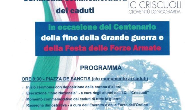 Il Sindaco e l’Amministrazione Comunale di Sant’Angelo dei Lombardi ha il piacere di invitarvi, in occasione del Centenario della fine della Grande guerra, alla manifestazione per la cerimonia commemorativa dei caduti che si terrà il giorno 5 novembre in Piazza De Sanctis alle ore 9.30 come da programma allegato.