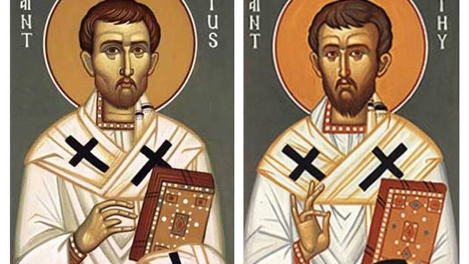 Oggi 26 gennaio la chiesa cattolica celebra i santi Timoteo e Tito, i due discepoli (Timoteo e Tito) sono destinatari di tre lettere “pastorali” dell’apostolo san Paolo, che fanno intravedere i primi lineamenti dei ministeri nella Chiesa. Timoteo viene dall’ebraismo e Tito dal mondo pagano. Paolo “arruola” Timoteo a Listra (Asia Minore) nel suo secondo viaggio missionario. Ma lo conosceva da prima con sua madre e sua nonna, ebree, che si fanno cristiane con lui. Timoteo resta poi sempre con Paolo, salvo quando lui lo manda in missione nelle chiese che ha fondato, per correggere errori e mettere pace. Come fa a Tessalonica, con la sua aria di ragazzo fragile. Ma «nessuno disprezzi la tua giovane età», gli scrive Paolo nella prima delle due lettere personali. E ai cristiani di Corinto lo presenta così: «Vi ho mandato Timoteo, mio figlio diletto e fedele nel Signore: vi richiamerà alla memoria le vie che vi ho insegnato». Dopo la prima carcerazione di Paolo a Roma, Timoteo prende la guida dei disorientati cristiani di Efeso, ai quali l’apostolo Paolo aveva già scritto dalla prigione: «Scompaia da voi ogni maldicenza, ira, clamore, asprezza». Non sono compiti facili: Paolo lo butta tra ogni sorta di problemi, errori, conflitti, aggravati da avventurieri, falsi profeti, pii confusionari. Lo manda a lottare. Paolo scrive la seconda lettera a Timoteo stando di nuovo in carcere, in attesa della morte: «Cerca di venire presso di me». Molti infatti lo hanno abbandonato; il fedele Tito si trova in Dalmazia. Dopo il martirio di Paolo, Timoteo continua a guidare la chiesa di Efeso fino alla morte, che una tradizione colloca nell’anno 97. L’ultima notizia di lui ce l’ha data Paolo alla vigilia del martirio. Le ultime notizie di Timoteo che si hanno dalla Bibbia sono alcune parole della lettera agli Ebrei dalle quali si può pensare ad un periodo di prigionia (Eb 13,23). Altre notizie su Timoteo le fornisce Eusebio di Cesarea che nella sua Storia ecclesiastica lo indica come primo vescovo di Efeso. Qui sarebbe morto lapidato per aver pubblicamente condannato il culto al dio pagano Dioniso. Tito, anch’egli compagno di san Paolo nell’attività missionaria, fu posto alla guida della Chiesa di Creta, è greco, un pagano convertito (forse da Paolo stesso). Compagno di momenti importanti: come la famosa riunione nota come concilio di Gerusalemme, con lo scontro tra nostalgici delle consuetudini rituali ebraiche e le necessità nuove e diverse dell’evangelizzazione nel mondo pagano. Tito, poi, è anche mediatore persuasivo, ed entusiasma Paolo risolvendo una grave crisi tra lui e i Corinzi. E lo vediamo quando dirige e porta a termine la prima grande iniziativa di solidarietà fra le Chiese: la famosa colletta per i poveri di Gerusalemme. L’ultima notizia di lui ce l’ha data Paolo alla vigilia del martirio. «Tito è in Dalmazia». Siamo sprovvisti di altre informazioni sugli spostamenti successivi di Tito e sulla sua morte.