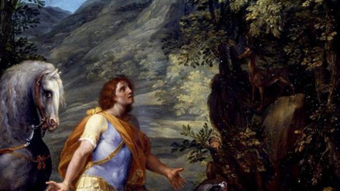 Oggi 20 settembre la chiesa festeggia sant’Eustachio, era un cavaliere dell’esercito romano di nome Placido, forse appartenente alla famiglia patrizia romana dei Placidi, ed era al servizio dell’allora imperatore Marco Ulpio Traiano. In contrasto al valore militare del generale Placido, dovuto a precedenti successi militari in Asia minore, vi era il suo carattere misericordioso e la sua benevolenza, espressa in opere caritatevoli, verso le classi sociali più deboli nonostante egli non fosse un cristiano. Nei tempi di pace si dedicava alla caccia e proprio durante una battuta nei pressi di Tivoli, mentre stava braccando un cervo, vide apparire in mezzo alle corna dell’animale una croce che emanava un intenso bagliore e udì una voce esclamare: «Placido, perché mi perseguiti? Io sono quel Cristo che tu non conosci, ma che onori con le tue opere.