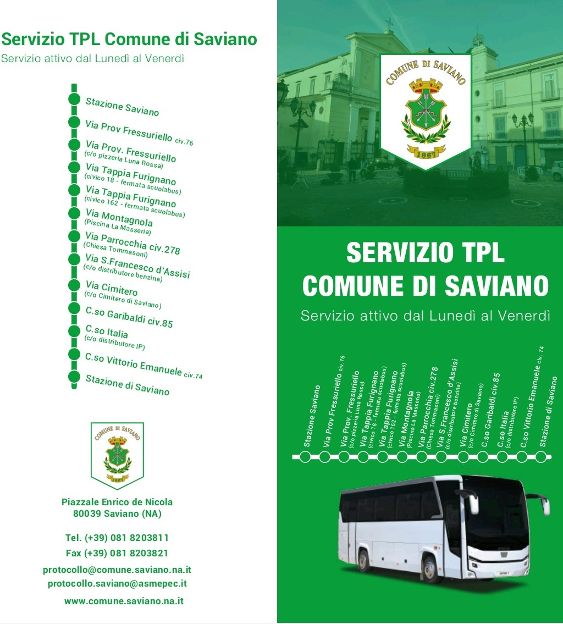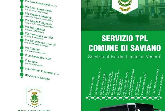 Verrà presentato alla cittadinanza giovedì 1 giugno, alle ore 11.00, nel piazzale antistante la stazione della Circumvesuviana, il servizio di trasporto pubblico locale con navetta del Comune di Saviano per collegare il centro (stazione Circumvesuviana) e le periferie con 8 corse giornaliere. Sono previste 9 fermate lungo il percorso con capolinea di partenza e arrivo la stazione della Circumvesuviana. Solo due corse giornaliere percorreranno via Tappia Furignano mentre le altre percorreranno via Provinciale Fressuriello, via Montagnola, via Parrocchia, via San Francesco, via Cimitero, corso Garibaldi, corso Italia e corso Vittorio Emanuele. Il servizio, gratuito e sperimentale, della durata di 6 mesi partirà lunedì 5 giugno con la prima corsa delle ore 06:00 mentre l’ultima è prevista alle ore 19.15.Saviano: parte il trasporto pubblico locale gratuito