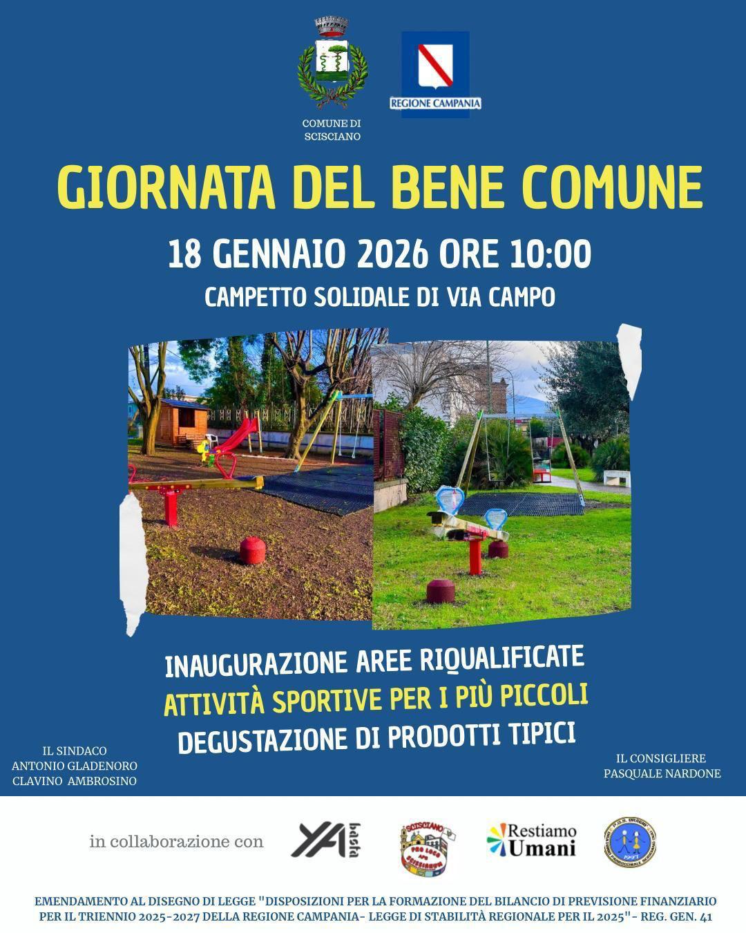 L’amministrazione comunale di Scisciano inaugurerà domenica 18 gennaio 2026, alle ore 10.00, lo spazio giochi del Campetto Solidale di via Campo con una mattinata di attività sportive e ricreative dedicate ai bambini, nell’ambito della “Giornata dei Beni Comuni”.