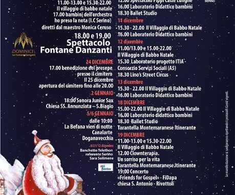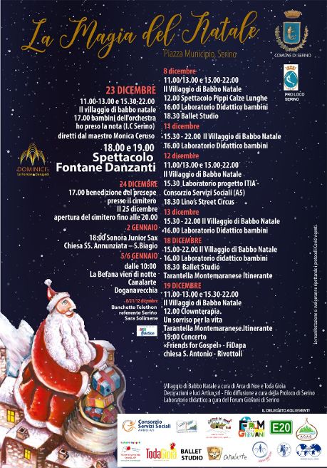 A Serino tutto pronto per il Natale 2021. In programma fino al 6 gennaio “La Magia del Natale”, un cartellone di eventi e concerti natalizi ampio e dedicato soprattutto ai più piccoli. Appuntamenti e spettacoli che si terranno nel pieno rispetto delle norme anti-covid e nel pieno spirito natalizio. Si inizia l’8 dicembre con il “villaggio di Babbo Natale”, lo spettacolo “Pippi Calze Lunghe” e il laboratorio didattico bambini che è possibile ritrovare anche in altre date. Menzione speciale per la giornata del 12 dicembre in cui ci sarà il progetto laboratorio ITIA con il Consorzio dei Servizi Sociali (A5).  Clownterapia e concerto “Friends for Gospel” di FiDapa (quest’ultimo nella chiesa di S. Antonio a Rivottoli) saranno i protagonisti del 19 dicembre. Attesissimo anche lo spettacolo delle Fontane Danzanti, alle 18 del 23 dicembre. Nel giorno della vigilia di Natale momento religioso con la benedizione del presepe presso il cimitero. Gli ultimi appuntamenti vedranno il 2 gennaio l’esibizione dei Sonora Junior Sax alla Chiesa SS. Annunziata a S. Biagio e nelle giornate del 5 e 6 il contributo dell’ormai marchio di fabbrica Canalarte con “La Befana vien di notte” a Doganavecchia. Un modo per tornare alla normalità e far rivivere lo spirito natalizio dopo la chiusura obbligata e doverosa dello scorso anno, per ridare gioia e sorrisi ai nostri bambini e a chiunque vorrà far visita, fanno sapere dall’amministrazione comunale. Il tutto con il massimo rispetto delle normative anti-Covid. Ogni appuntamento, infatti, è stato studiato e organizzato tenendo scrupolosamente conto delle regole e delle indicazioni vigenti. Spazio anche alla solidarietà: infatti, l’8, l’11 e il 12 dicembre sarà presente il banchetto della fondazione Telethon.SERINO: ECCO IL CARTELLONE DI EVENTI NATALIZIO