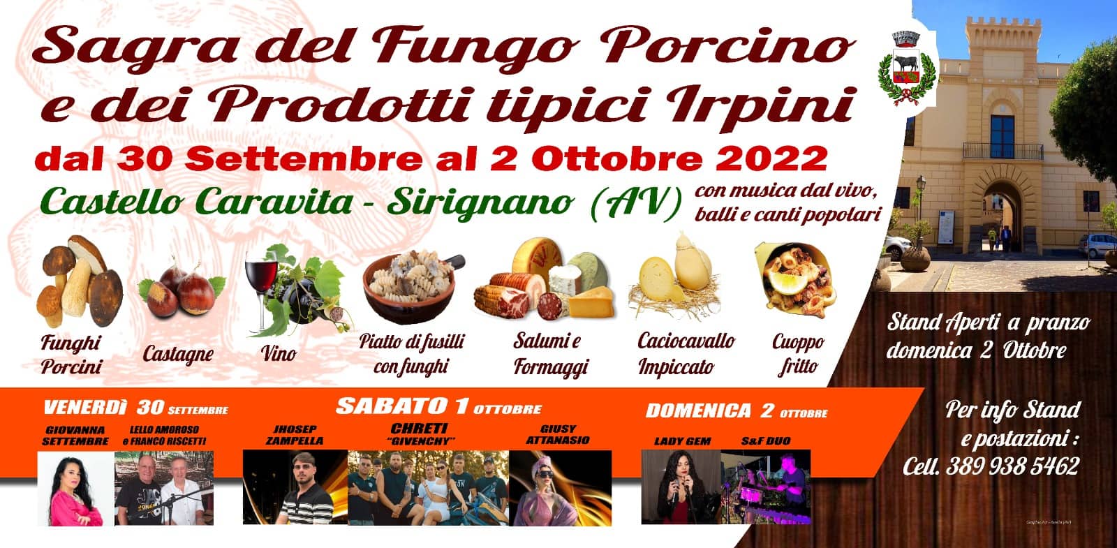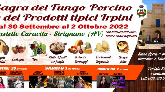 Tutto pronto nel baianese e in particolare a Sirignano dove sta per iniziare la prima sagra della stagione autunnale. Si parte il 30 settembre fino al 2 ottobre, tre giorni intensi e ricchi di iniziative. Non solo piatti tipici e la specialità del fungo porcino ma anche tanta musica e divertimento. L’evento si svolgerà nell’area dove sorge il Castello Caravita.