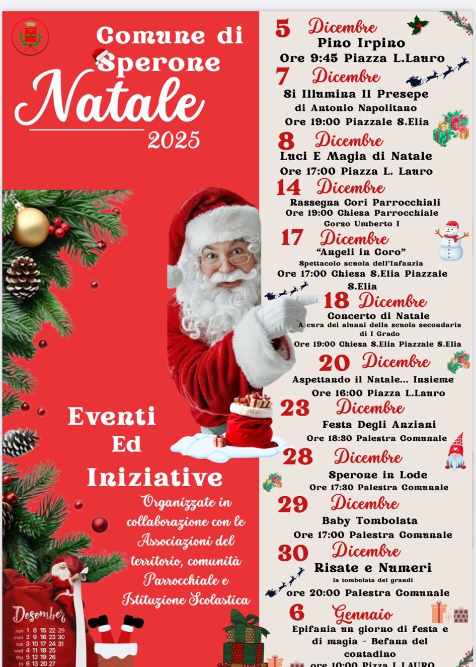 Sperone si prepara a vivere un Natale 2025 ricco di appuntamenti, con un calendario fitto di iniziative pensate per coinvolgere famiglie, bambini, associazioni e l’intera comunità. Il programma, organizzato dal Comune in collaborazione con le realtà associative del territorio, la comunità parrocchiale e l’istituzione scolastica, accompagnerà residenti e visitatori dal 5 dicembre al 6 gennaio, in un clima di festa, tradizione e condivisione.