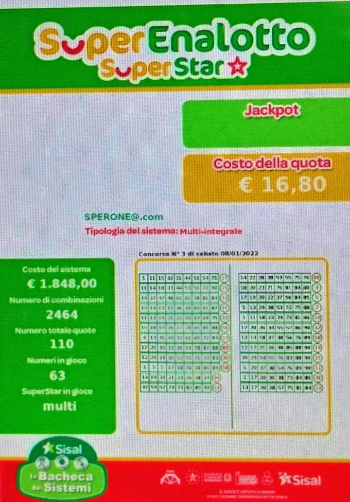 L’anno nuovo inizia presso la ricevitoria Speronese dell’Augustus-Bar con un super sistemone per centrare il sei all’estrazione di questa sera del SuperEnalotto che vale 136,6 milioni di euro. Il sistema si compone di 110 quote da 16,80 ciascuna che sviluppa 2464 combinazioni diverse e vede in gioco 63 numeri. Chi è interessato può ritirare la quota presso la ricevitoria o chiamando il numero 335 72 78 512. Buon inizio anno con la fortuna.