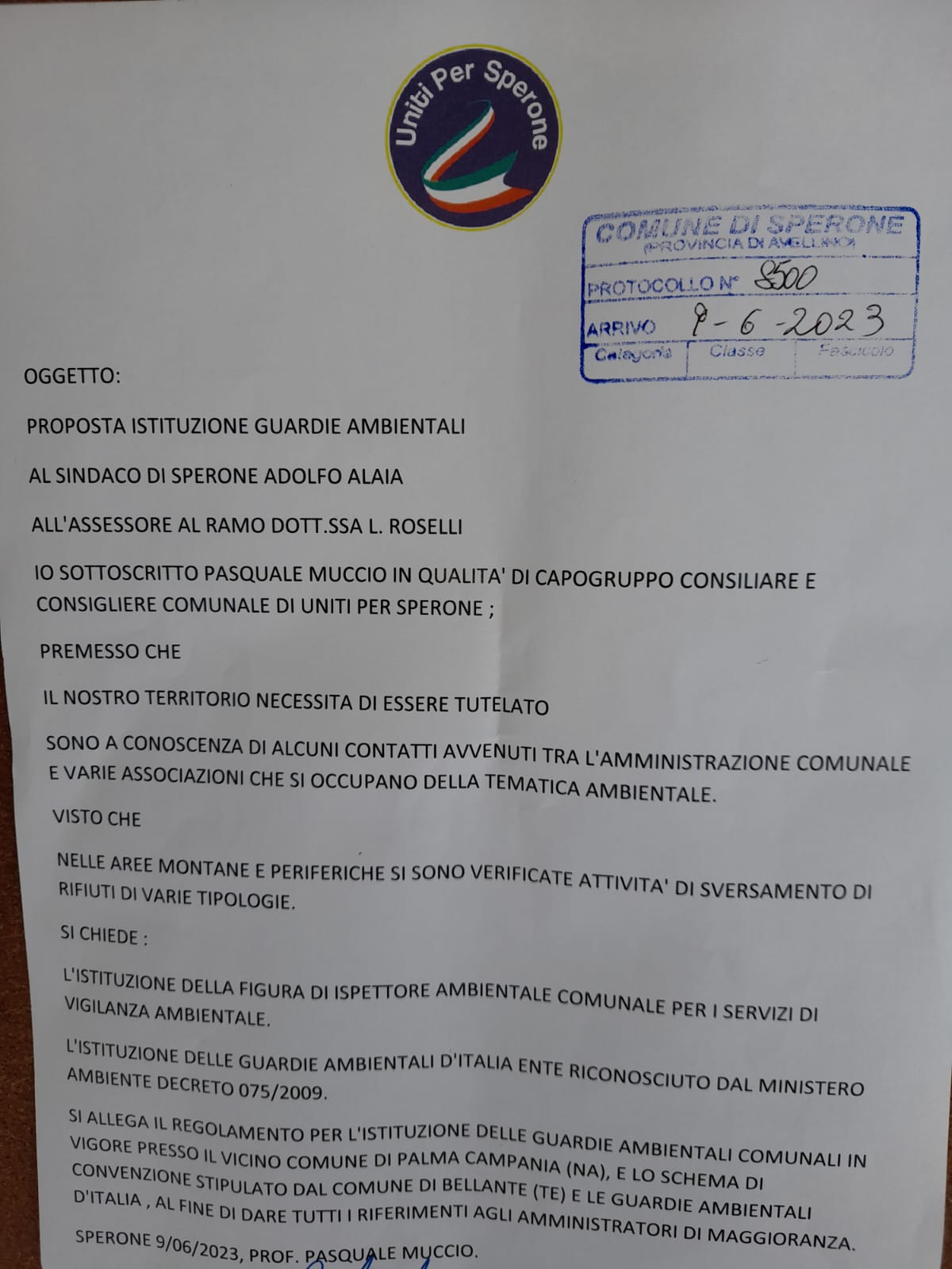 Con una richiesta ufficiale protocollato al Comune di Sperone oggi, il gruppo “Uniti per Sperone” chiede che l’amministrazione comunale retta dal sindaco Adolfo Alaia, istituisca sul territorio comunale le Guardie Ambientali, questo a seguito dei numerosi sversamenti di rifiuti di ogni genere che sempre più spesso avvengono nelle area montane del paese e non solo.