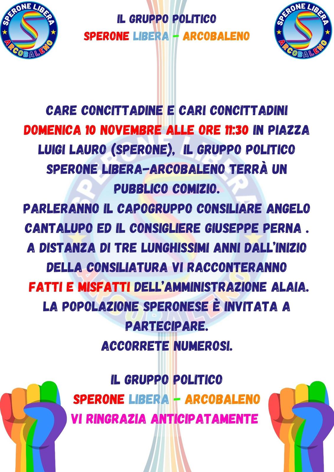 Nel corso del comizio, il gruppo *Sperone Libera-Arcobaleno* si propone di raccontare ai cittadini i “fatti e misfatti” dell’attuale amministrazione comunale guidata dal sindaco Alaia, esponendo la propria visione e le proprie critiche sulla gestione amministrativa. Questo incontro pubblico sarà l’occasione per condividere con la popolazione di Sperone le riflessioni del gruppo politico e discutere apertamente delle problematiche e delle iniziative locali.