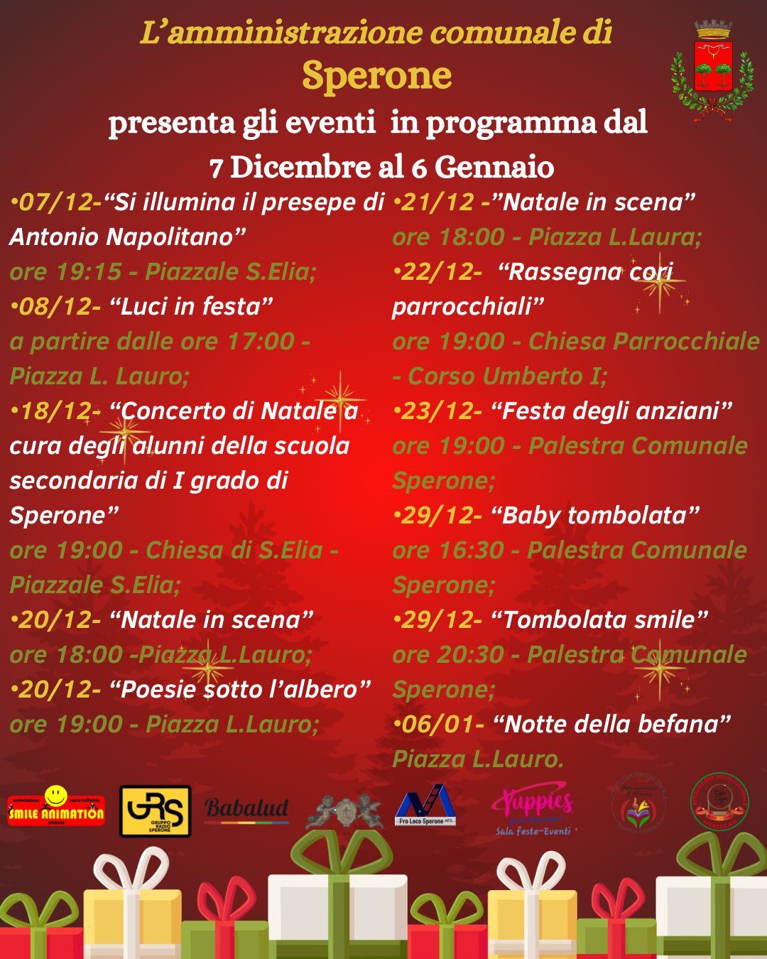 L’Amministrazione Comunale di Sperone ha organizzato un ricco programma di eventi natalizi che si svolgeranno dal 7 dicembre al 6 gennaio. Le iniziative, pensate per coinvolgere cittadini di tutte le età, promettono di creare un’atmosfera magica e di condivisione per tutta la comunità.