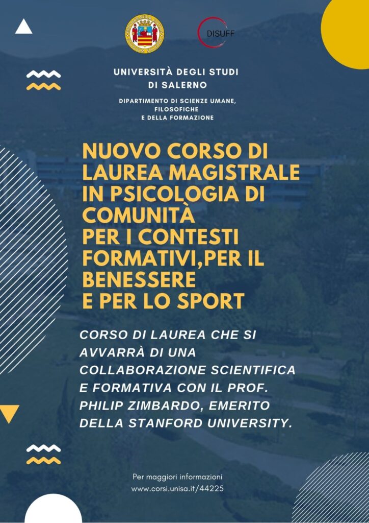 Istituito il nuovo Corso di Laurea Magistrale in Psicologia di Comunità per i Contesti Formativi, per il Benessere e per lo Sport presso il Dipartimento di Scienze Umane, Filosofiche e della Formazione (https://corsi.unisa.it/44225). Il corso, della durata biennale, ha l’obiettivo di formare professionisti psicologi in grado di operare nella comunità in una pluralità di contesti afferenti all’ambito socio-educativo, scolastico, del benessere e dello sport riservato a laureati in psicologia che prevede anche una collaborazione scientifica e formativa con il prof. Philip Zimbardo, emerito della Stanford University.