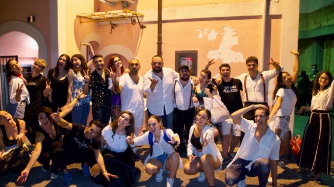 Nel cuore del centro storico di Terzigno, rione Bianchi, si ritorna a respirare aria di teatro, di arte, di cultura e lo si fa attraverso un percorso itinerante organizzato magistralmente dall’Associazione Teatrale “I Giovani della Piazza”. Troppo il periodo di assenza, la paura di non poter ritornare a recitare era tanta e così appena si è presentata l’occasione, si va in scena, fra la gente desiderosa di dimenticare quello accaduto. Lo spettacolo è un viaggio itinerante fra le bellezze di Napoli, ad accompagnare lo spettatore è una guida che fa da apripista al messaggio augurale di Pulcinella, alla spettacolare coreografia preparata dall’Academy of Arts dei maestri Salvatore Renna e Lia Di Martino, allo sketch comico rivisitato di Amicizia, ai monologhi del caffè e della Filumena tanto cara a Eduardo, passando per la cartomante si arriva a conoscere il pensiero della bella ‘mbriana chiudendo con un esilarante diverbio fra marito e moglie. Un format che ha permesso di trascorrere un’ ora lontano dai problemi del quotidiano, si ritorna a respirare cultura proprio come uno striscione che gli organizzatori della manifestazione hanno affisso: Terzigno è cultura, mai cchiu’ incudine, ma martiell.