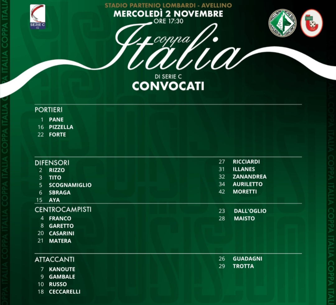 In vista del match tra Avellino e Turris, valevole per il secondo turno eliminatorio della Coppa Italia di serie C, mister Massimo Rastelli ha diramato la seguente lista di convocati: