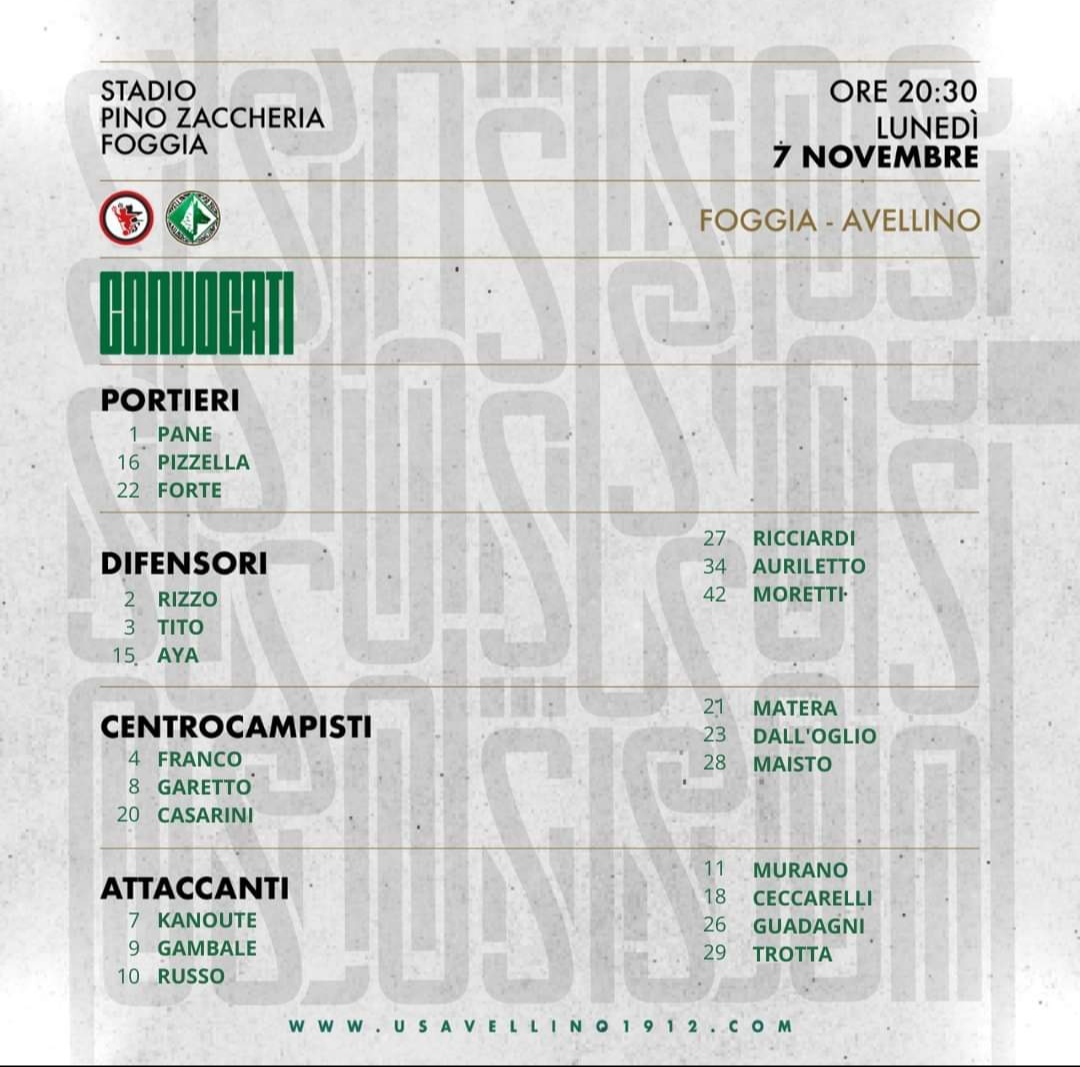 vista del match tra Foggia ed Avellino, previsto per la dodicesima giornata del campionato di serie C, girone C, mister Massimo Rastelli ha diramato la seguente lista di convocati:
