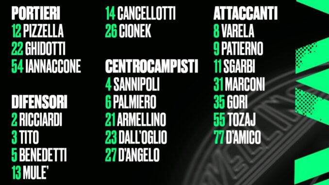Attaccanti: 8 Varela, 9 Patierno, 11 Sgarbi, 31 Marconi, 35 Gori, 55 Tozaj, 77 D’Amico.