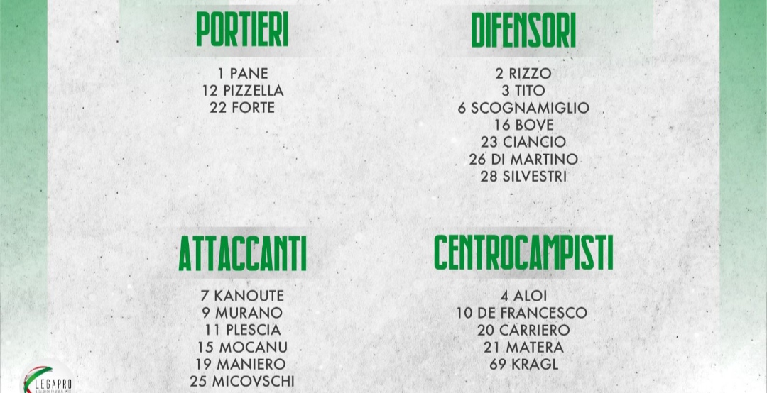 La lista dei convocati, in cui figurano ancora i Primavera Di Martino e Mocanu, rientra dalla squalifica Matera.