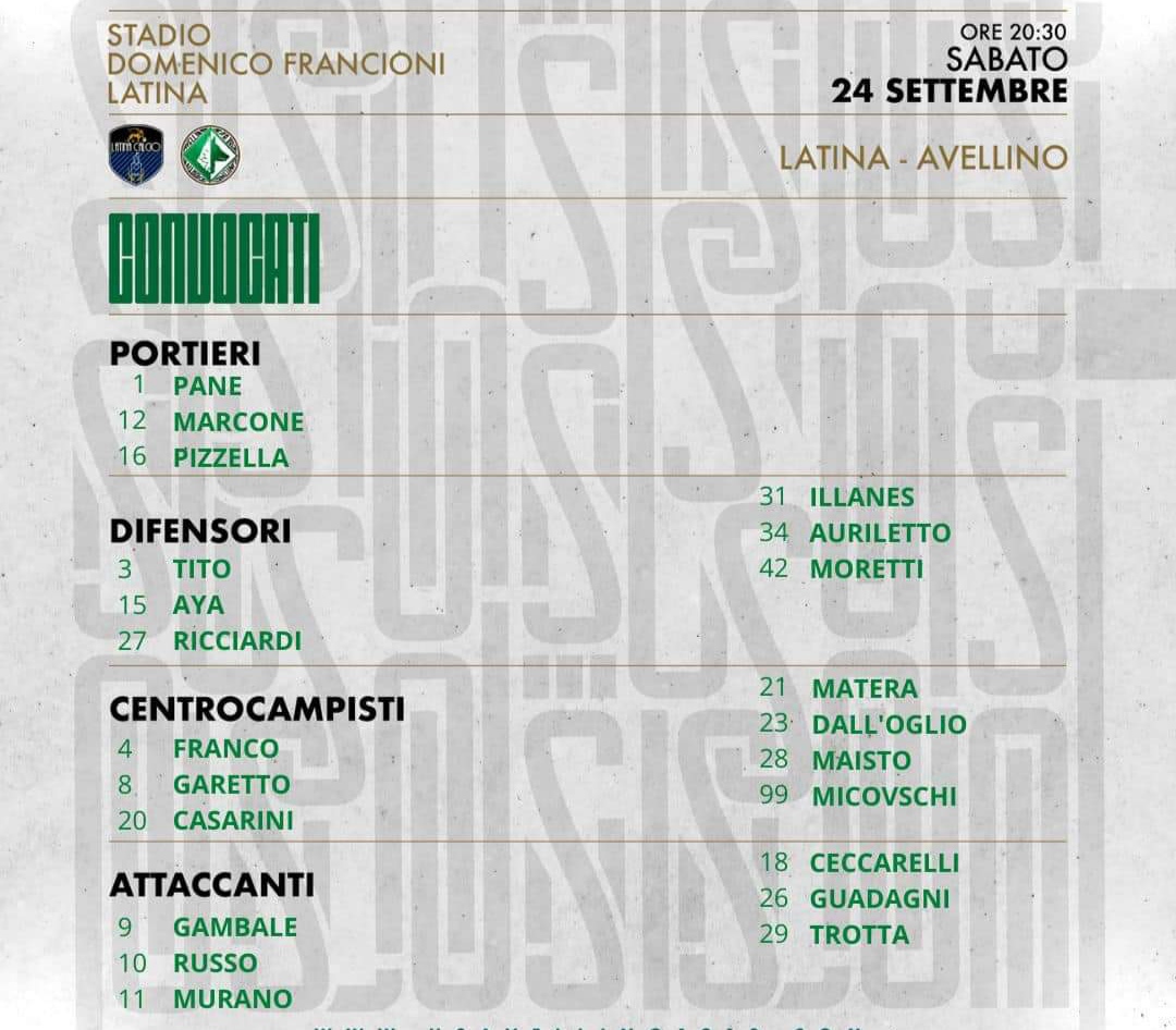 I convocati per Latina, domani i lupi affronteranno i laziali al “Francioni” alle 20,30. Gara valida per la 5a giornata del campionato di Serie C girone C. Taurino deve fare a meno di 4 elementi:
