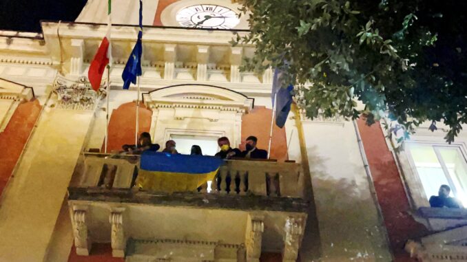 Natalyie si è poi recata insieme con il sindaco e con tutti i consiglieri comunali ad apporre la bandiera dell’Ucraina sul balcone del municipio.