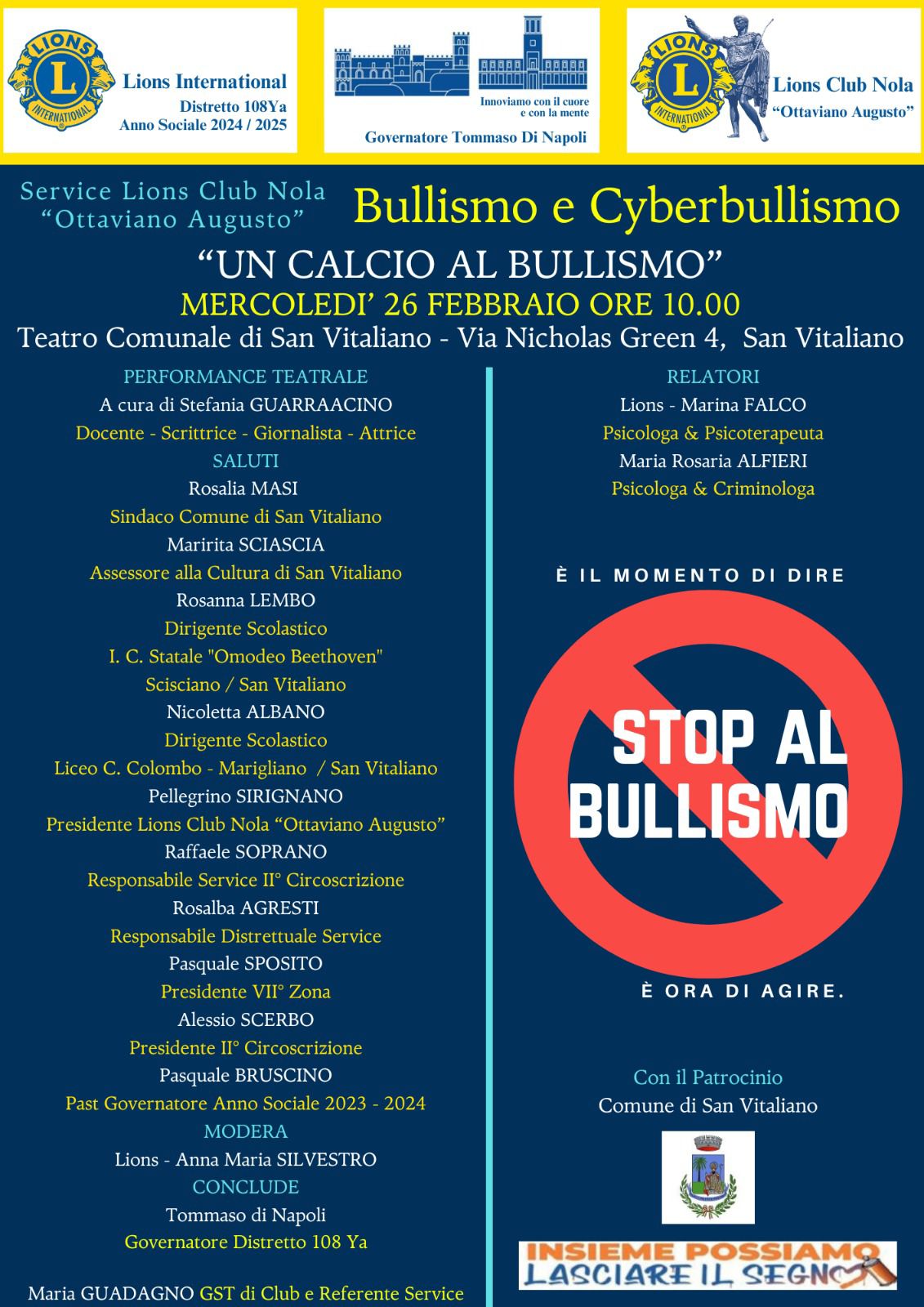 La Dirignte in pensione Anna Maria Silvestro, con il patrocinio del Comune di San Vitaliano, organizza un importante evento di sensibilizzazione contro il bullismo e il cyberbullismo dal titolo “Un Calcio al Bullismo”. L’appuntamento è fissato per mercoledì 26 febbraio alle ore 10:00 presso il Teatro Comunale di San Vitaliano, situato in Via Nichola Green 4.