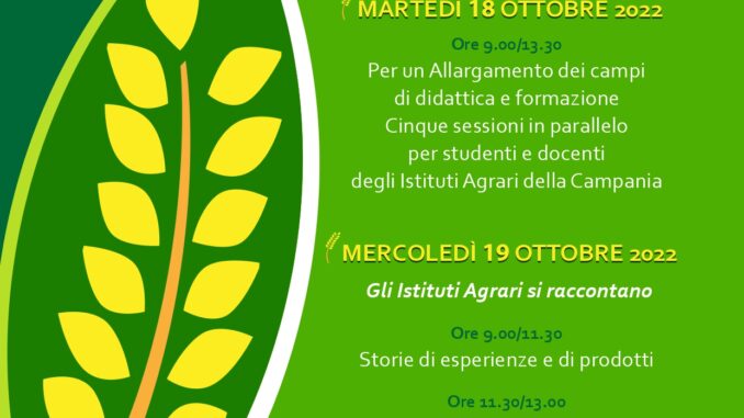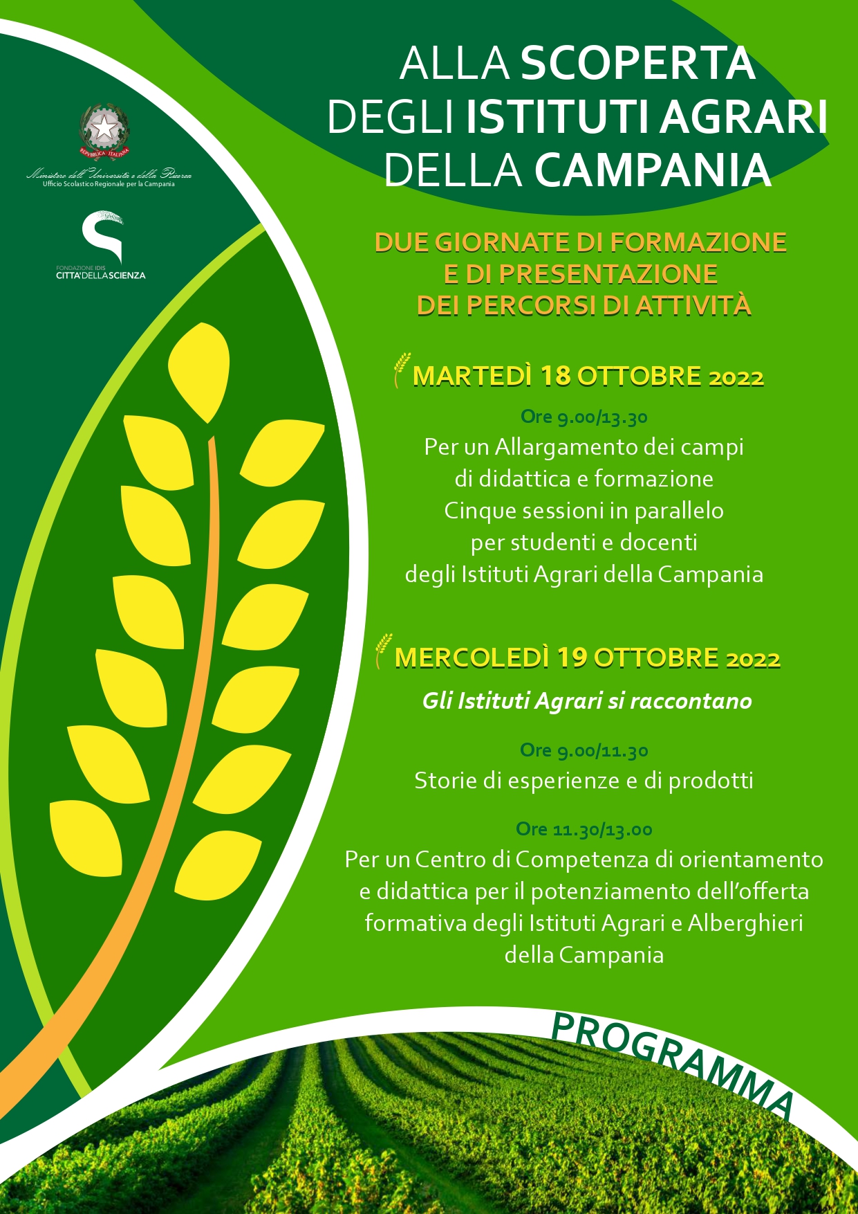 Sessioni, incontri, confronti, racconti, presente e futuro degli Istituti Agrari della Campania in una due giorni in calendario martedì 18 e mercoledì 19 ottobre a Napoli a Città della Scienza.