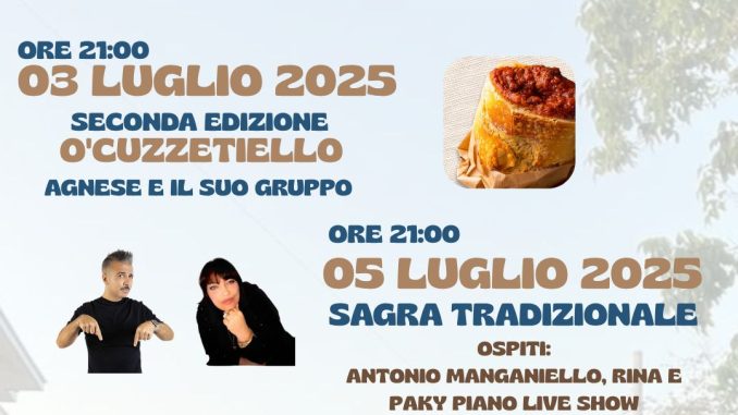 Sabato 5 luglio, sempre alle 21:00, riflettori puntati sulla sagra tradizionale, con stand gastronomici e piatti tipici della tradizione locale. A rendere ancora più coinvolgente la serata, le esibizioni di Antonio Manganiello, Rina e il Paky Piano Live Show, per uno spettacolo che promette emozioni e divertimento.