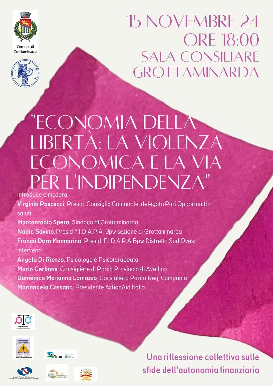 In prossimità della “Giornata internazionale per l’eliminazione della violenza sulle donne” il Comune di Grottaminarda con la collaborazione della Fidapa Bpw sezione di Grottaminarda, organizza il convegno dal titolo: “Economia della libertà: la violenza economica e la via per l’indipendenza”, una riflessione collettiva sulle sfide dell’autonomia finanziaria.