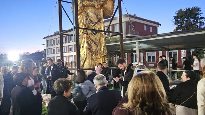 Una volta posata sul piazzale, a pochi metri da terra, la statua è apparsa in tutta la sua imponenza e bellezza, offrendo ai presenti un’occasione rara: osservarla da vicino. Molti fedeli si sono soffermati in silenzio, tra preghiera e contemplazione, visibilmente commossi da un momento tanto insolito quanto significativo.