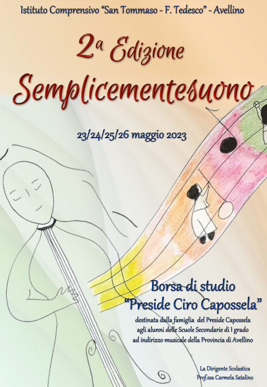 Al via la seconda edizione di “Semplicementesuono” 2023, concorso per l’assegnazione di borse di studio destinate alle alunne e agli alunni delle scuole secondarie ad indirizzo musicale di Avellino e Provincia che, i familiari del compianto preside Ciro Capossela hanno ideato e realizzato già dallo scorso anno, in collaborazione con l’ Istituto Comprensivo San Tommaso – F. Tedesco diretto dalla d.s.prof.ssa Carmela Satalino , con un riscontro di partecipazione e consenso molto ampio. Il Concorso si svolgerà ad Avellino, presso l’auditorium della scuola secondaria di I grado “San Tommaso”, dal 23 al 26 maggio 2023 e l’iscrizione sarà del tutto gratuita. Il regolamento recante ogni indicazione e modalità di partecipazione, arricchito per la seconda edizione di alcune novità, sarà pubblicato sul sito www.icstommaso-ftedesco.edu.it entro il 10 febbraio 2023.
