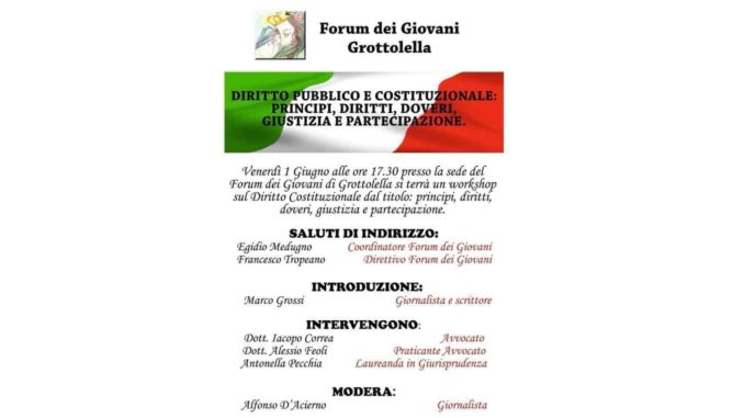 Venerdì 1 giugno alle ore 18, presso la sede del Forum della gioventù di Grottolella, nella frazione Taverna del Monaco, si terrà il workshop sul diritto pubblico e costituzionale dal titolo: Principi, diritti, doveri, giustizia e partecipazione. Evento fortemente voluto da tutto il direttivo e dai giovani del Forum dei giovani. Il seminario sarà introdotto dal Coordinatore del Forum Egidio Medugno e da Francesco Tropeano membro del direttivo. Introdurrà il workshop il giornalista e scrittore Marco Grossi. Seguiranno gli interventi del dott. Alessio Feoli, dell’avvocato Iacopo Correa e della laureanda in giurisprudenza Antonella Pecchia, quest’ultima molto attiva in tutto il territorio regionale in occasione di attività simili. Durante il seminario sarà analizzata la Carta costituzionale, mettendone in risalto sia la prima parte concernente i principi e i valori fondamentali, i diritti e i doveri, sia la seconda parte con una analisi specifica sul ruolo della magistratura, del procedimento legislativo, del titolo V, del ruolo della pubblica amministrazione, degli enti locali e del rapporto che intercorre tra il nostro ordinamento giuridico, la Costituzione e i Trattati Europei e la normativa europea. Inoltre durante la giornata saranno letti ed analizzati diversi articoli della Costituzione della Repubblica Italiana. Il seminario sarà moderato dal giornalista Alfonso D’Acierno. “Lo scopo del seminario è quello di avvicinare i giovani della nostra comunità alla scoperta di quelle norme e di quei principi che regolano la nostra convivenza civile e che ci fanno stare insieme come cittadini di una medesima nazione che è al tempo unica e indivisibile. Noi dunque crediamo che leggere, studiare, analizzare e capire le norme della Costituzione sia uno sforzo utilissimo a cui tutti siamo chiamati come giovani e come futura classe dirigente, anche perché nella Costituzione noi ritroviamo tutta la storia della nostra nazione. Lo studio approfondito della Costituzione, per tutti noi, costituisce il modo migliore per rafforzare l’ideale della legalità, della giustizia sociale, della tolleranza, della integrazione e il senso di partecipazione attiva e consapevole di noi giovani alla vita associata e comunitaria” – dichiarano i componenti del direttivo del Forum giovani di Grottolella.