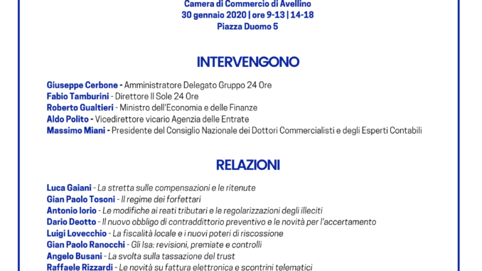 La Camera di Commercio di Avellino è partner de Il Sole 24 Ore ed organizza, in collaborazione con Unioncamere Campania e gli Ordini Professionali, nella sede camerale di Piazza Duomo il consueto convegno dedicato alle novità fiscali.