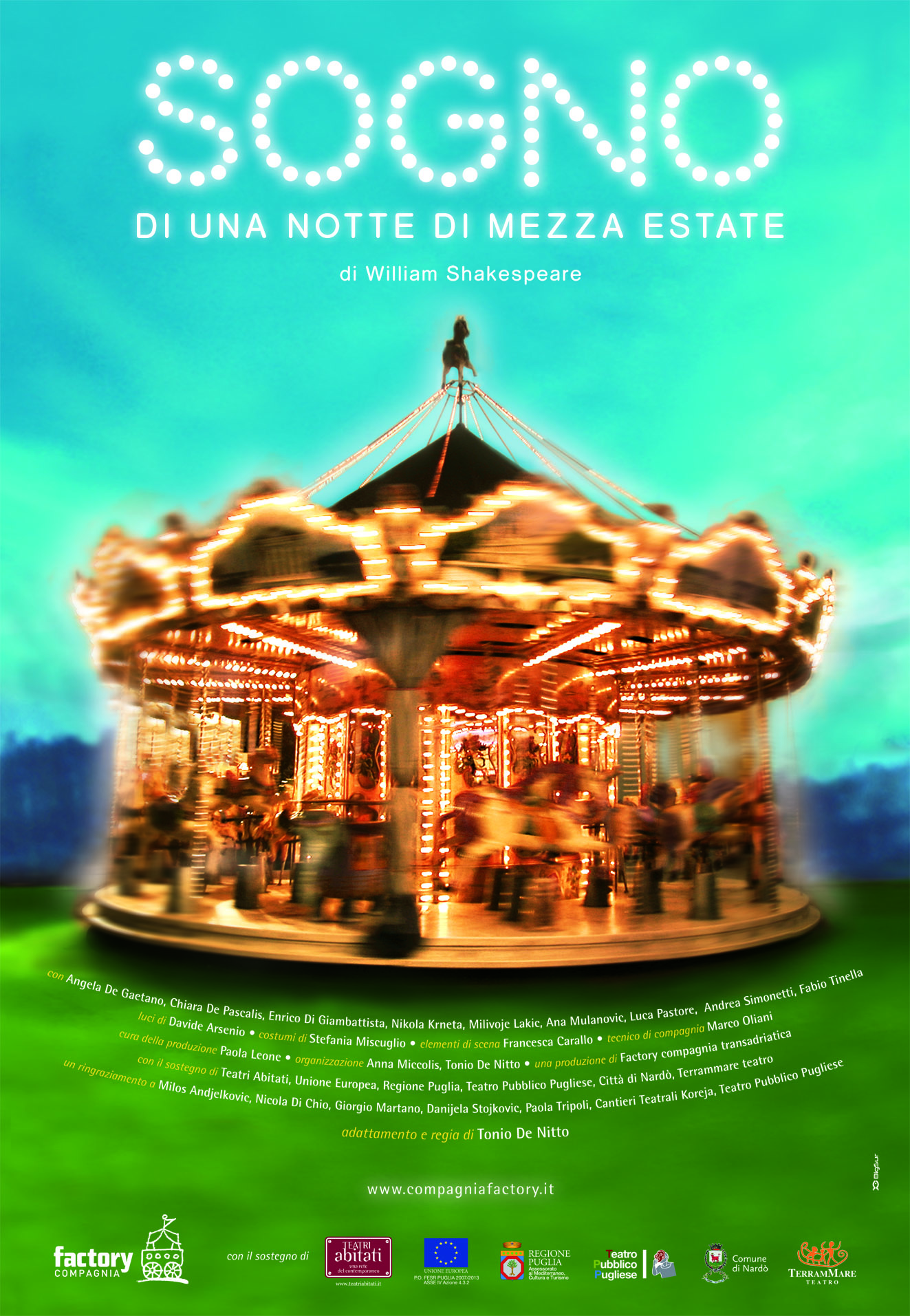 Con l’adattamento e la regia di Tonio De Nitto, la commedia del Bardo diventa una specie di grande e coloratissimo cartoon, con i personaggi che gesticolano come burattini, che rincorrono l’amore, lo confondono e giocano sotto un influsso magico.