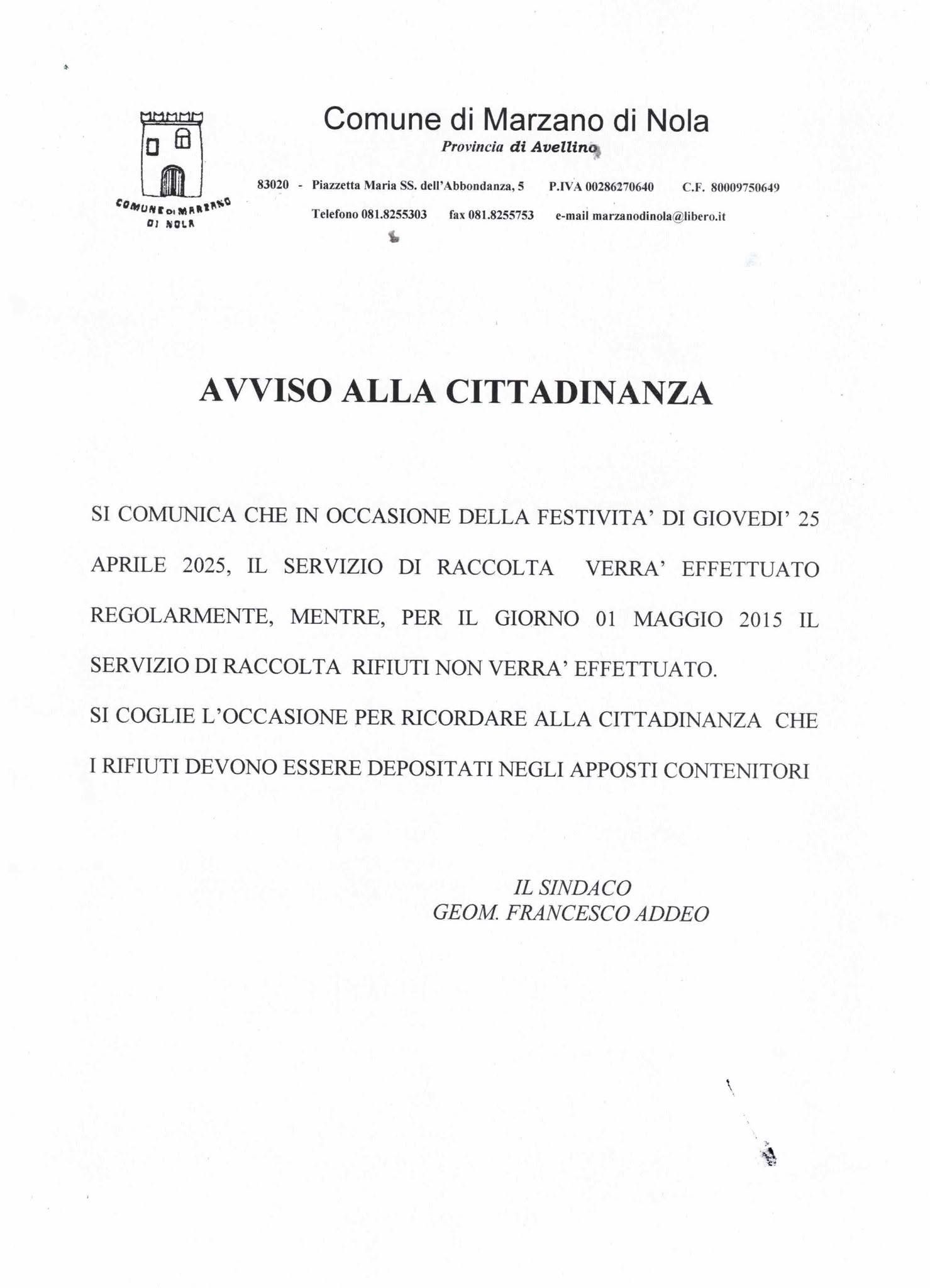 Il Comune di Marzano di Nola informa la cittadinanza sulle variazioni del servizio di raccolta rifiuti in occasione delle prossime festività nazionali. Con un avviso firmato dal Sindaco, geom. Francesco Addeo, si comunica che: