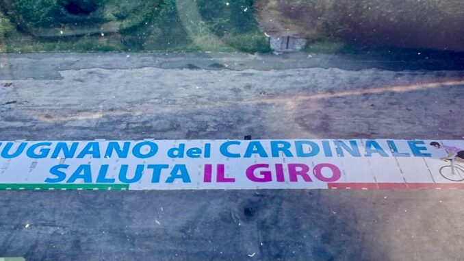 Nel parcheggio del cimitero comunale, un gruppo di giovani di Mugnano del Cardinale ha realizzato una scritta di benvenuto: “Mugnano del Cardinale saluta il Giro d’Italia”. Un gesto semplice ma sentito, che sarà ben visibile al passaggio della corsa e rappresenta l’abbraccio simbolico dell’intero paese alla manifestazione.