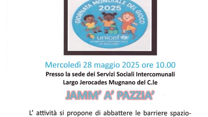 Domani, mercoledì 28 maggio, il Consorzio dei Servizi Sociali “Vallo di Lauro – Baianese” parteciperà con entusiasmo alla Giornata Mondiale del Gioco 2025, un evento promosso dall’UNICEF per sottolineare il valore del gioco come diritto fondamentale per ogni bambino. L’iniziativa è fortemente sostenuta dalla direttrice del Consorzio, dottoressa Rosa Grano, che ha voluto fare di questa giornata un’occasione concreta di incontro, condivisione e crescita comunitaria. L’evento è organizzato dagli operatori del Centro Sociale Polifunzionale ” Centro Benessere Psicologico” del consorzio dei servizi sociali Ambito A6
