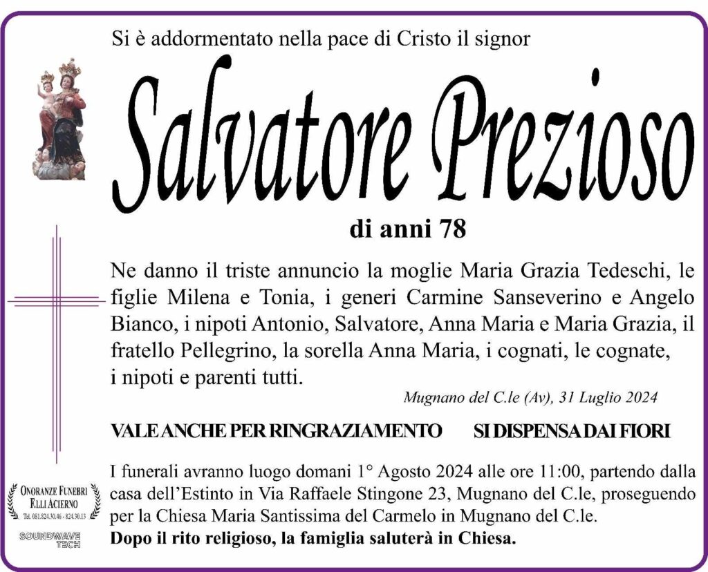 Ne danno il triste annuncio la moglie Maria Grazia Tedeschi, le figlie Milena e Tonia, i generi Carmine Sanseverino e Angelo Bianco, i nipoti Antonio, Salvatore, Anna Maria e Maria Grazia, il fratello Pellegrino, la sorella Anna Maria, i cognati, le cognate, i nipoti e parenti tutti. I funerali avranno luogo domani 1 agosto 2024 alle ore 11 partendo dalla casa dell’estinto in via Raffaele Stingone 23a Mugnano del Cardinale per la chiesa Maria SS. Del Carmelo in Mugnano. Dopo il rito religioso la famiglia saluterà in Chiesa.