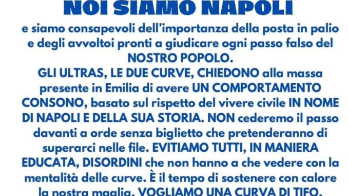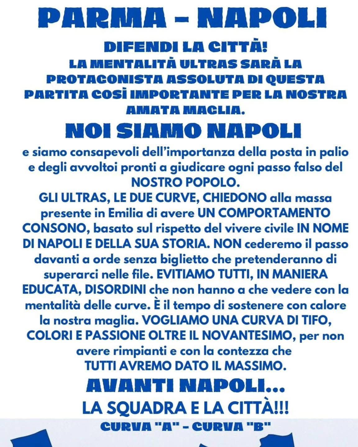 In vista della delicata partita Parma-Napoli, le due curve partenopee lanciano un messaggio chiaro e deciso a tutti i sostenitori che seguiranno la squadra in trasferta. La partita, fondamentale per il cammino degli azzurri, diventa un momento simbolico per riaffermare non solo la passione per la maglia, ma anche la responsabilità di rappresentare degnamente la città di Napoli e la sua storia.