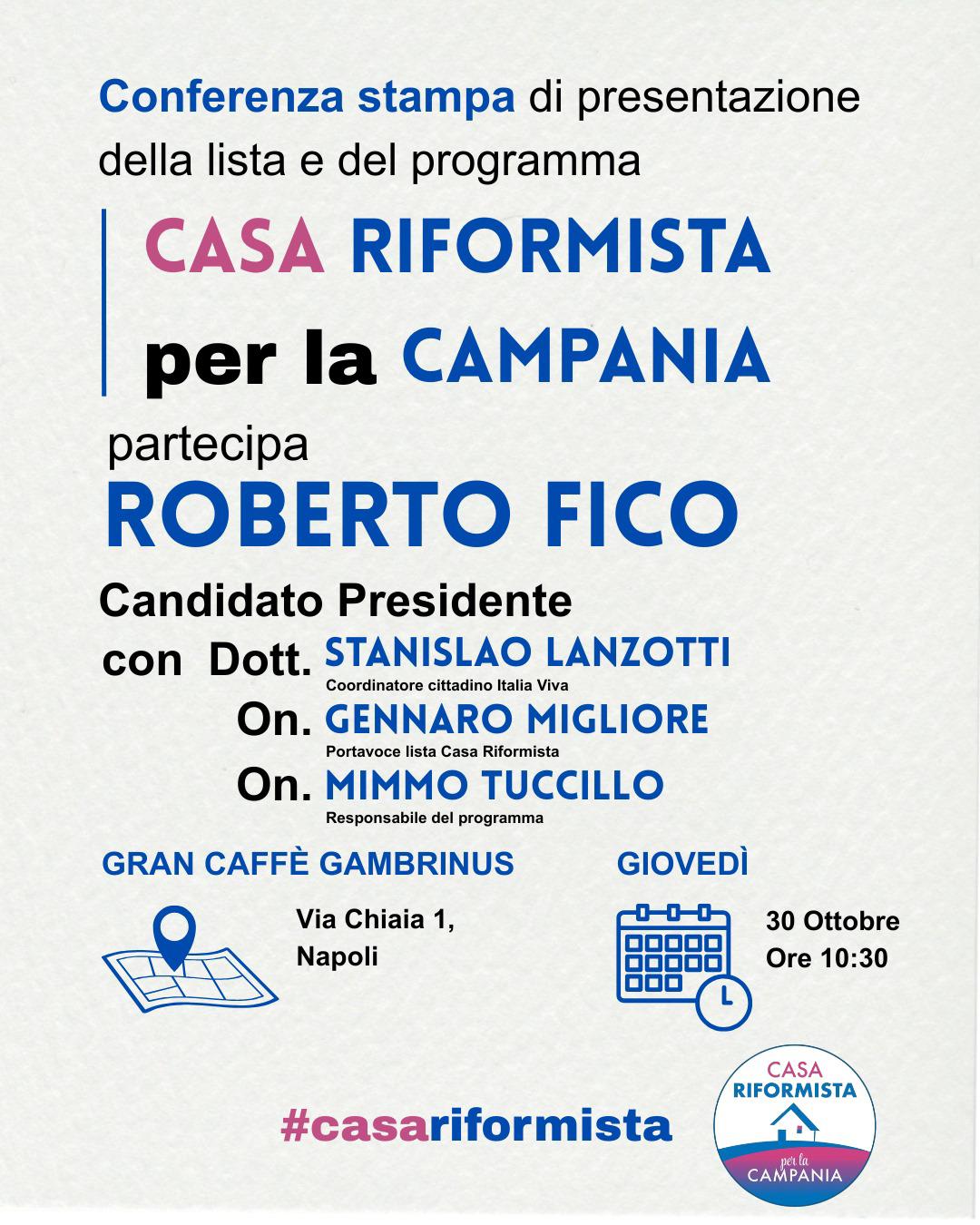 Giovedì 30 Ottobre alle ore 10,30 presso il Gran Caffè Gambrinus di Napoli si terrà la conferenza stampa di presentazione della lista “Casa Riformista” in campo per le elezioni regionali della Campania del 23 e 24 Novembre.