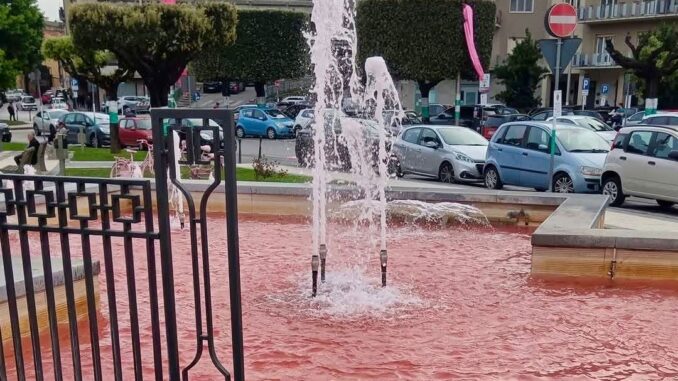 Un tocco simbolico e suggestivo ha trasformato il cuore di Atripalda in occasione del passaggio del Giro d’Italia. L’acqua della fontana monumentale di piazza Umberto I si è tinta di rosa, richiamando il colore della maglia più ambita e rendendo omaggio alla storica corsa ciclistica che anche quest’anno attraversa i territori irpini.