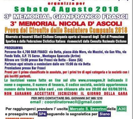 La macchina organizzativa del Team Cycling Botta sta mettendo a punto gli ultimi dettagli, ma il Memorial Gianfranco Frasci-Nicola D’Ascoli è stato programmato di tutto punto per la validità di prova del Circuito dello Scalatore Campania 2018 a cronometro sotto l’egida dell’US Acli Comitato Provinciale di Avellino. Appuntamento a Siano sabato 4 agosto (domani) per questo breve esercizio contro il tempo in salita su un percorso di 4,7 chilometri tra Via Botta (ritrovo alle 13:00 presso il Bar Frasci e partenza del primo corridore alle 15:00), Piazza Aldo Moro, Via Mazzini, Rotatoria San Vito e traguardo fissato nella zona della Montagna Spaccata. Gli organizzatori capitanati da Antonio Botta hanno previsto una ricca dotazione di premi al primo assoluto col miglior riscontro cronometrico, ai primi tre di ogni categoria e alla società con il maggior numero di iscritti.