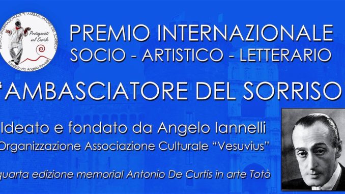 Domenica 1 Ottobre a partire dalle ore 18:00 nel Cortile del Maschio Angioino andrà in scena la IV Edizione del prestigioso Premio Internazionale Ambasciatore del Sorriso memorial Antonio de Curtis in arte Totò ,fondato dall’artista poliedrico Angelo Iannelli e organizzato dall’Associazione Vesuvius in collaborazione con il comune di Napoli guidato dal Sindaco Luigi De Magistris, assessorato cultura e Turismo guidatato da Nino Daniele . Vista la valenza cultura e sociale dell’iniziativa , hanno dato sostegno all’ ambasciatore del sorriso Angelo Iannelli da sempre in difesa dei deboli e dell’ambiente , il mondo della Chiesa, dell’ associazionismo e delle istituzioni con importanti patrocini morali come: La Regione Campania, la Diocesi di Napoli, L’Unicef, Telethon, Fondazione Città della Scienza , Istituto Culturale delle Politiche Europee e Ambientali, Udilm sez Cicciano, l’Associazione Ciro Vive, il Simposio delle Muse e i comuni di: Salerno, Sorrento, Piano di Sorrento, Nola, Camposano, Striano, Saviano, San Vitaliano,Visciano, Scisciano , Marigliano , Mariglianella, Brusciano e San Giorgio a Cremano . La manifestazione vuole premiare oltre alle varie sezioni presenti nel bando del concorso , gli artisti che con la propria arte hanno donato un sorriso alle fasce deboli. Da tutta la nazione attesi tantissimi poeti, scultori, fotografri e giornalisti.