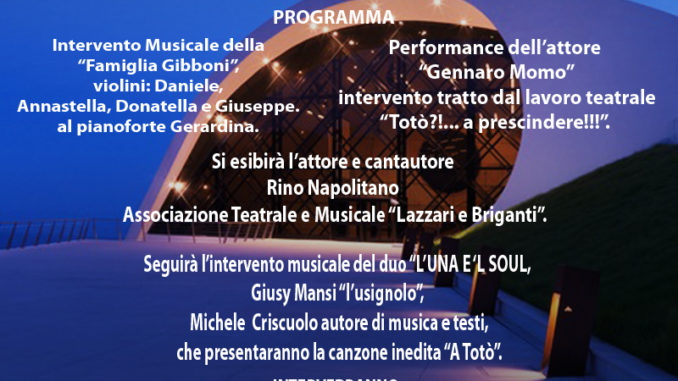 In occasione delle celebrazioni del 50° anniversario della morte di Totò, 1898 – 1967, a Ravello, il 12 settembre 2017 alle ore 18.30, presso lAuditorium Oscar Niemeyer si terrà uno spettacolo gratuito in onore del grande artista dalla straordinaria umanità. La manifestazione è organizzata dallAssociazione Amici di Totò a prescindere! Onlus e dalla Fondazione omonima, dal Comune di Ravello, dalla Soprintendenza Archeologica Belle Arti e Paesaggio Salerno e Avellino, dalla Fondazione Comunità Salernitana, dallAssociazione Tesori Campani, dallAssociazione Paxcristi di Cava de Tirreni. Presenterà lattore Antonio Angrisano, figlio darte. Intervento Musicale della Famiglia Gibboni, violino Daniele, Annastella, Donatella e Giuseppe, pianoforte Gerardina. Performance dellattore Gennaro Momo, intervento tratto dal lavoro teatrale Totò?!… a prescindere!!!. Seguirà la manifestazione con lesibizione dellattore e cantautore Rino Napolitano. Dulcis in fundo la serata si concluderà con lintervento musicale del duo LUNA E L SOUL, formato da Giusy Mansi lusignolo e da Michele Criscuolo, autore di musica e testi, che presenterà la canzone inedità A Totò. Recentemente la cantante Giusy. Nel corso della serata saranno proiettate le immagini più esilaranti dei films di Totò e Peppino De Filippo, a cura del Maestro Daniele Nannuzzi, Presidente dal 2012 dellAssociazione Italiana Autori della Fotografia Cinematografica.