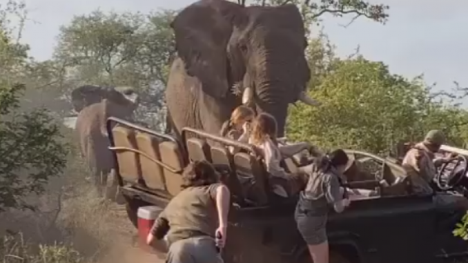 Le registrazioni video di diversi passeggeri stanno circolando sui social media. Domenica 28 novembre alcuni elefanti hanno attaccato i veicoli della società per safari Eco Training, con a bordo numerosi turisti durante un safari nella Selati Game Reserve, ai margini del parco nazionale Kruger, nel nord-est del Sudafrica. Come si vede nel video, un animale di sei tonnellate ha speronato il veicolo e usato le sue zanne per spingerlo fuori strada mentre i passeggeri, spaventati, fuggono per mettersi in salvo. La causa sarebbe da attribuire alla stagione degli amori durante la quale gli elefanti maschi producono alti livelli di testosterone e, di conseguenza, risultano molto più aggressivi. Gli attivisti per i diritti degli animali criticano l’organizzatore per aver disturbato la mandria con i fuoristrada durante la stagione degli amori. Di seguito le immagini drammatiche dell’attacco:
