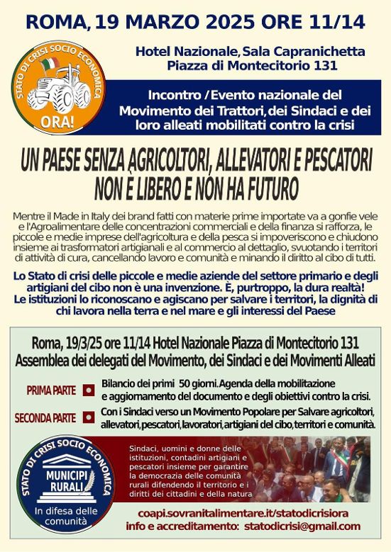 Il Movimento dei trattori a Roma il 19 marzo per ribadire la richiesta di stato di crisi al Governo e per aprire una stagione nuova di riforme insieme ai sindaci ed a quanti sono interessati a Salvare le piccole e medie imprese dell’agricoltura, della pesca e della trasformazione del cibo Comunicato – Invito Stampa Roma, 14 marzo 2025 Il Consiglio Unitario della Mobilitazione degli agricoltori e pescatori italiani contro la crisi si è convocato per il 19 marzo a Roma per un incontro – evento tra i delegati del Movimento dei Trattori, i sindaci che hanno risposto all’appello ad adottare delibere di sostegno della piattaforma e diversi fra gli alleati mobilitati contro la crisi delle piccole e medie aziende dell’agricoltura, della pesca e dell’artigianato. L’incontro – cui saranno presenti i delegati del Movimento dei trattori – si terrà nella parte pubblica dalle 11 alle 14 del 19 marzo 2025 nella Sala Capranichetta dell’Hotel Nazionale, in Piazza Montecitorio 131 per poi proseguire nel pomeriggio in sessione organizzativa interna che definirà l’agenda per i prossimi mesi. L’Evento si articola in una doppia sessione. Nella prima verrà fatto il bilancio delle iniziative in campo dal 28 gennaio ad oggi: decine di presidi, manifestazioni e mobilitazioni (in molte regioni italiane che si sono sviluppati per settimane e ancora sono in corso), circa un centinaio di delibere di Giunte e consigli Comunali e di intere Province con cui le comunità stanno esprimendo la condivisione del percorso, decine di incontri con i Prefetti, riunioni e incontri con le Regioni sono solo alcune delle attività che in circa cinquanta giorni di mobilitazioni sono state messe e si stanno mettendo in campo da un movimento che si va estendendo e radicando in tutte le Regioni Italiane. Sotto lo slogan “Un Paese senza agricoltori, allevatori e pescatori non è libero e non ha futuro” sarà analizzato il tema delle crisi aziendali delle piccole e medie aziende, per le quali il movimento chiede al Governo e alle Regioni misure straordinarie che vadano oltre la liturgia e la propaganda dell’Agroalimentare Italiano e del Made in Italy che va a gonfie vele fino ad arrivare al riconoscimento dello stato di crisi, per poter agire con strumenti eccezionali all’altezza del compito di restituire reddito alle aziende, arrestando il gravissimo processo di impoverimento e indebolimento dell’ossatura del sistema produttivo territoriale. Recita la locandina/invito a seguire l’incontro, che sarà trasmesso via streaming per la parte pubblica,: “mentre il Made in Italy dei brand prodotto con materie prime importate va a gonfie vele e l’agroalimentare delle concentrazioni commerciali e della finanza si rafforza, le piccole e medie imprese dell’agricoltura e della pesce si impoveriscono e chiudono insieme a loro chiudono bottega anche i trasformatori artigianali e i commercianti al dettaglio, svuotando i territori rurali e cancellando lavoro e comunità, minando il diritto al cibo di tutti”. “Chiediamo con forza alle istituzioni che aprano il confronto sullo stato di crisi delle imprese, come già sta avvenendo in alcuni regioni – ricorda il Consiglio Unitario – e l’occasione dell’incontro del 19 marzo con i sindaci che ci stanno sostenendo sarà l’occasione per passare alla fase del lavoro nei territori chiedendo alle regioni di verificare e certificare le diverse crisi che, ovviamente, hanno forma diversa nelle diverse realtà aprendo il confronto per rimettere al centro della loro azione la priorità di difendere e tutelare chi lavora nella terra e nel mare” Tema dell’incontro, anche “la costruzione con i sindaci di un movimento popolare che abbia nei municipi rurali la base per chiamare a raccolta le Comunità Rurali e quelle urbane del cibo. I Sindaci, del resto, sono la parte delle istituzioni più a diretto contatto con la sofferenza e la crisi e possono essere il riferimento da cui ripartire nei territori per dare voce e rappresentanza ad un mondo che la politica tutta dovrebbe saper ascoltare. In attesa che la politica nazionale dimostri di essere all’altezza del compito, mentre ancora il Consiglio Unitario attende la risposta del Governo alla richiesta di incontro, il Movimento non solo non si ferma ma, anzi, rilancia l’appello e il lavoro perché la politica e il Paese guardino in faccia la realtà e rispondano alle istanze democratiche degli agricoltori, dei pescatori, dei sindaci e dei loro alleati in mobilitazione” È con questo spirito che il Consiglio Unitario annuncia, fra l’altro, che da lunedì 17 marzo inizierà un ciclo di incontri con i Partiti e le Forze Politiche che sono state tutte invitate a confrontarsi con una delegazione del Movimento. Diversi sono i Partiti e le forze politiche che hanno risposto positivamente di maggioranza e di opposizione e con cui si stanno concordando i calendari. Si comincia lunedì pomeriggio con l’incontro con il Movimento Cinque Stelle e, nei prossimi giorni, con la Lega. Invito alle agenzie, della stampa, della radio e televisione a partecipare all’incontro del 19 marzo di cui si allega l’invito.