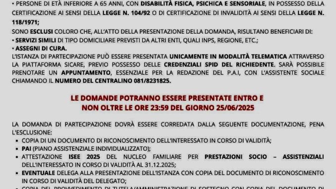 È inoltre necessario prenotare un colloquio con l’assistente sociale, indispensabile per la redazione del Piano Assistenziale Individualizzato (PAI). L’appuntamento può essere fissato contattando il centralino comunale al numero 081 8231825.