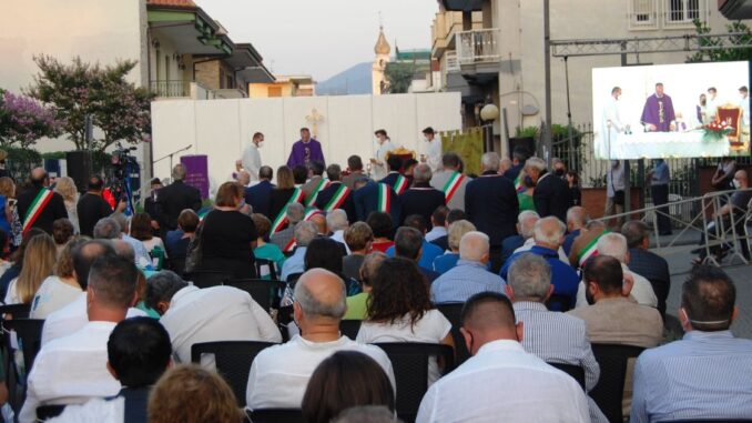 Venerdì 23 Luglio 2021 alle ore 17,30, è stata celebrata, presso la Piazza A. Musco- Saviano, in forma ufficiale, la solenne Messa in suffragio del Dott. Carmine Sommese, compianto Sindaco di Saviano, stroncato dal Corona Virus il 17 Aprile 2020. L’organizzazione del Cerimoniale tecnica (Video Amplificazioni, due grandi schermi che hanno dato la possibilità a tutti di seguire la Cerimonia), è stata affidata alla Ditta “Perretta Grup – Saviano”. La Celebrazione, spostata per motivi meteo dal 17 al 23, ha visto la partecipazione di numerosi cittadini, tutti i componenti delle due famiglie, le autorità comunali, politiche, militari e la protezione civile (Gruppo Saviano). La S. Messa è stata concelebrata dai seguenti Sac.: Don Paolino Franzese, Don Andrea Pesapane, Don Salvatore De Simone,, Don Peppino D’Oria e dal Mons. Prezioso De GIulio ed è stata accompagnata dal gruppo strumentale e vocale dei Maestri: Giuseppe Russo (Oboe), Orsola Russo (Mezzo soprano e violinista), Gennaro Russo (Organo), Marilena Mirra (Voce). La bontà, l’impegno, il sacrificio, l’amore per il prossimo, durante la missione terrena sanitaria e politica di Carmine Sommese sono stati ampiamente menzionati nei vari discorsi tenuti in successione dal Presidente del Consiglio Comunale di Saviano Avv. Carmela Vecchione, da Don Paolino Franzese, Parroco della Chiesa dell’Immacolata, dal Sindaco di Saviano Avv. Vincenzo Simonelli che ha ribadito alla fine del discorso, la volontà dell’Amministrazione Comunale di intitolare, la VIa Mulino, all’ex Sindaco Dott. Sommese, luogo dove egli è nato e cresciuto ed infine dalla consorte del defunto, la Dott.ssa Marina Gambardella, che ha ringraziato tutti i presenti per la viva partecipazione, espressione del grande affetto per il compianto Dott. Sommese, amato e stimato dai suoi concittadini sia come sindaco che come politico. Entrambe le famiglie insieme a tutti i cittadini hanno condiviso il dolore per la perdita del loro amato congiunto e commossi si hanno pregato per la sua anima in Paradiso. (Pasquale Iannucci)