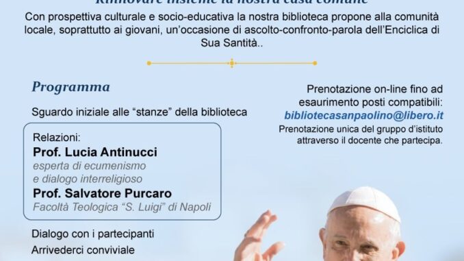 Onorati della collaborazione in atto con la Diocesi di Nola per la promozione di eventi e iniziative culturali, siamo lieti invitarvi all’evento del 30 settembre prossimo presso la Biblioteca Diocesana San Paolino. Un’occasione per gettare lo sguardo oltre gli sterili localismi e scoprire l’enorme responsabilità che abbiamo nei confronti delle future generazioni”.
