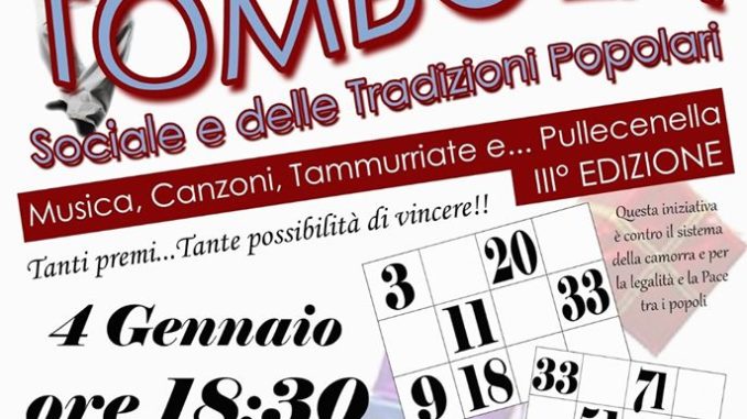 Sabato 4 Gennaio a partire dalle ore 18.30 , presso l’Aula Consiliare del Comune di Brusciano , si svolgerà la III edizione della “Tombolata Sociale e delle Tradizioni Popolari” Evento inserito nel cartellone delle feste natalizie dal Sindaco Giuseppe Montanile . La Manifestazione è organizzata dall’Associazione multiculturale Vesuvius di Angelo Iannelli. Lo scopo dell’evento è quello di valorizzare un gioco come la tombola che aggrega diversi ceti sociali, senza distinzione di classe o titoli, nonché il tenere vive le tradizioni popolari. Alla conduzione del cartellone “Pulcinella” simbolo di speranza e di legalità, rappresentato dall’ ambasciatore del sorriso Angelo Iannelli , è prevista l’adesione di alcuni personaggi dello spettacolo che non faranno mancare la loro esibizione per regalare un sorriso ed un’emozione tra una vincita e l’altra Non mancherà una tammurriata allegra della paranza Vesuvius e il brindisi finale per augurare ‘buona fine’ è un ottimo inizio 2020 per il primo evento dell’Amministrazione Comunale per il nuovo anno . Non ci resta, quindi, che recarci a Brusciano Aula Consiliare per vivere una giornata di vere e genuine emozioni con l’Associazione Vesuvius punto di riferimento in Campania per la valorizzazioni delle tradizioni popolari e per tematiche sociali.