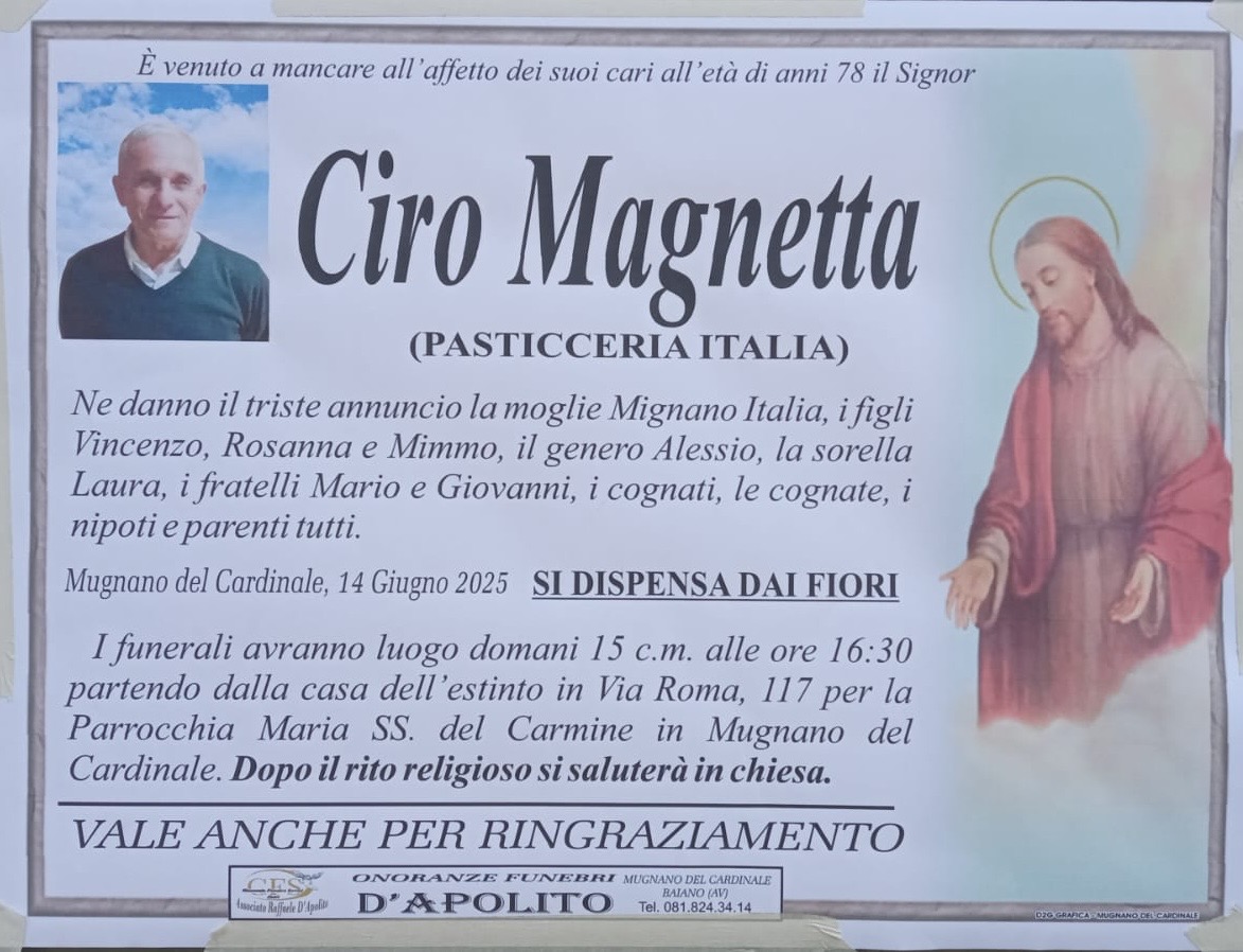 Mugnano del Cardinale (AV), 14 giugno 2025 – La comunità di Mugnano del Cardinale è in lutto per la scomparsa del signor Ciro Magnetta, noto e stimato cittadino, conosciuto da tutti per la sua lunga attività nella Pasticceria Italia. Ciro si è spento all’età di 78 anni, lasciando un grande vuoto tra i suoi cari e in tutti coloro che lo hanno conosciuto.