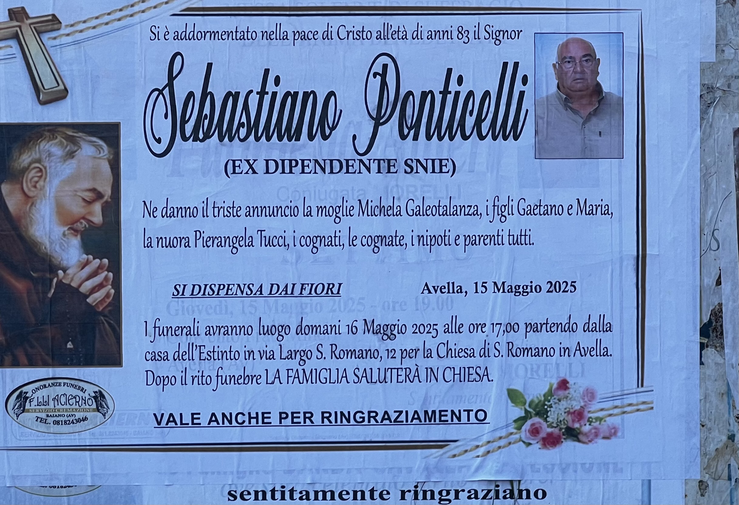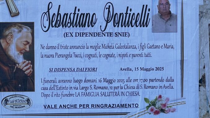 Avella – Si è spento serenamente all’età di 83 anni Sebastiano Ponticelli, ex dipendente SNIA e figura conosciuta e rispettata nella comunità avellana. A darne il triste annuncio la moglie Michela Galeotalanza, i figli Gaetano e Maria, la nuora Pierangela Tucci, insieme a cognati, cognate, nipoti e parenti tutti.